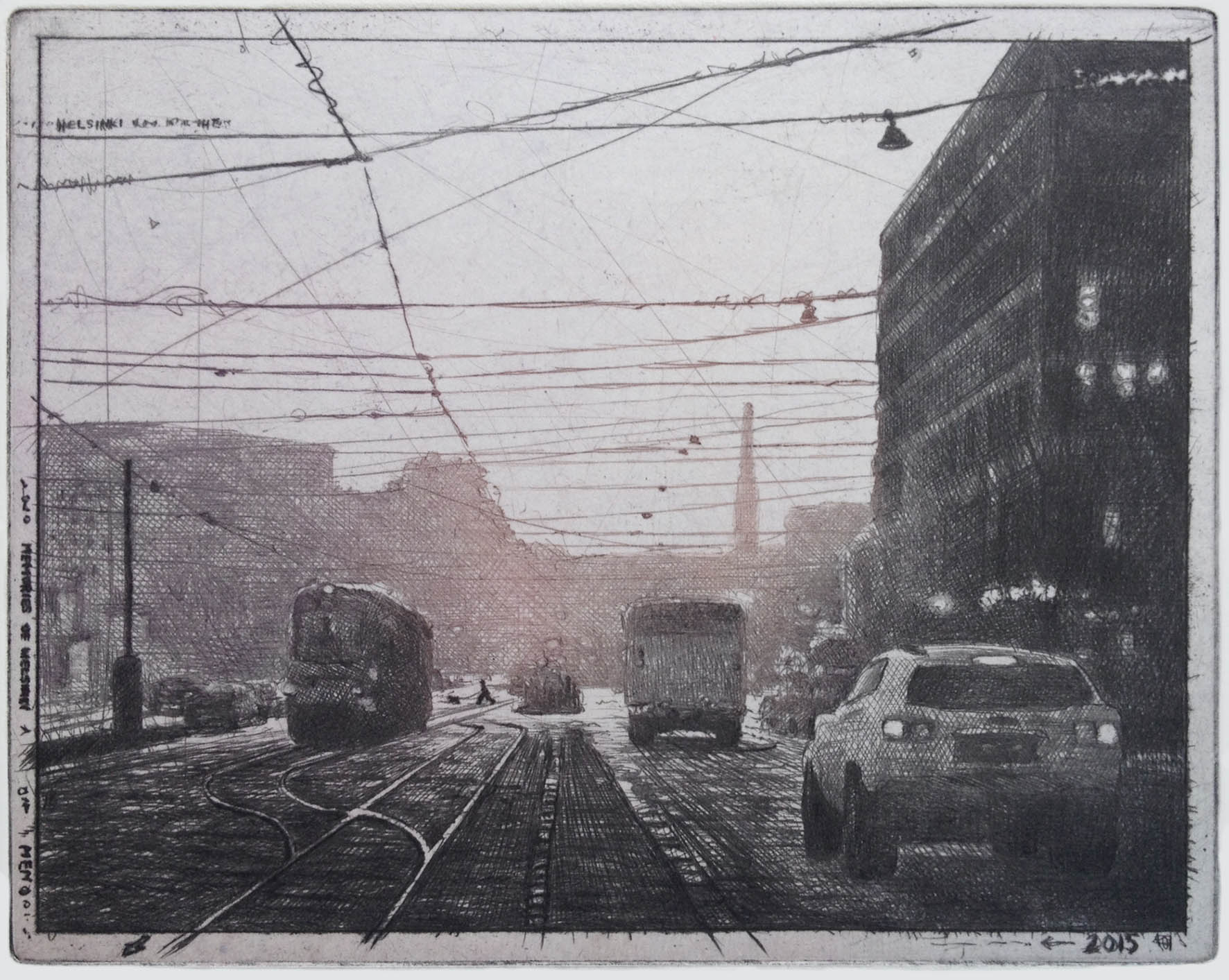 Jag gillar det långsamma arbetet. Rispandet i den blanka kopparplåten, motståndet och kommunikationen med materialet. Det är som ett samtal. Efter ett förarbete, då bilden sakta tagit form så framträder bilden av sig själv. Plåten talar om för nålen hur den ska rista. Det är en nära relation, en kommunikation som förs här och nu men lika mycket med alla som varit före mig. Närvaron av Rembrandt, Whistler, Fridell och andra som tidigare i historien suttit böjda och koncentrerade framför sina plåtar är påtaglig och inspirerande. Det finns inga krav, inget står i vägen för tillblivelsen av bilden. Halva jobbet är att rista plåten, andra halvan är att trycka den. Alla tryck blir lite olika, beroende på luftfuktighet, rumstemperatur, mitt känsloläge och sinnesstämning. Det är ständigt nytt, alltid något att lära. Jag behöver inget annat. En torrnål, en plåt, färg, papper och en tryckpress. Det är bra så.