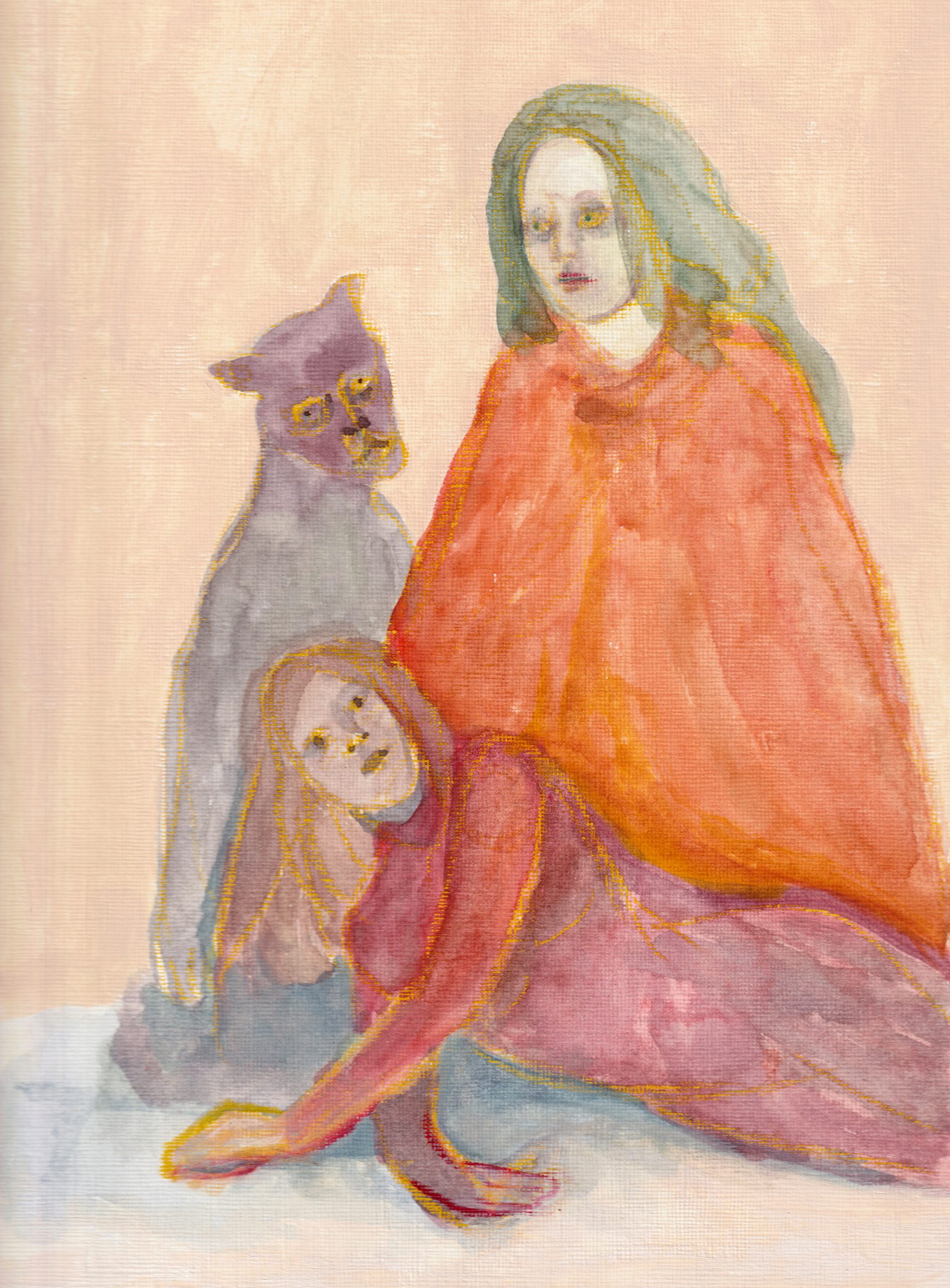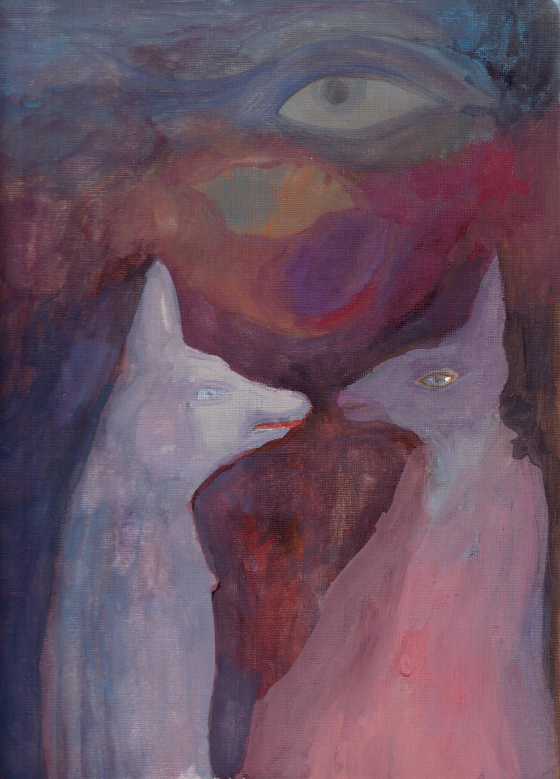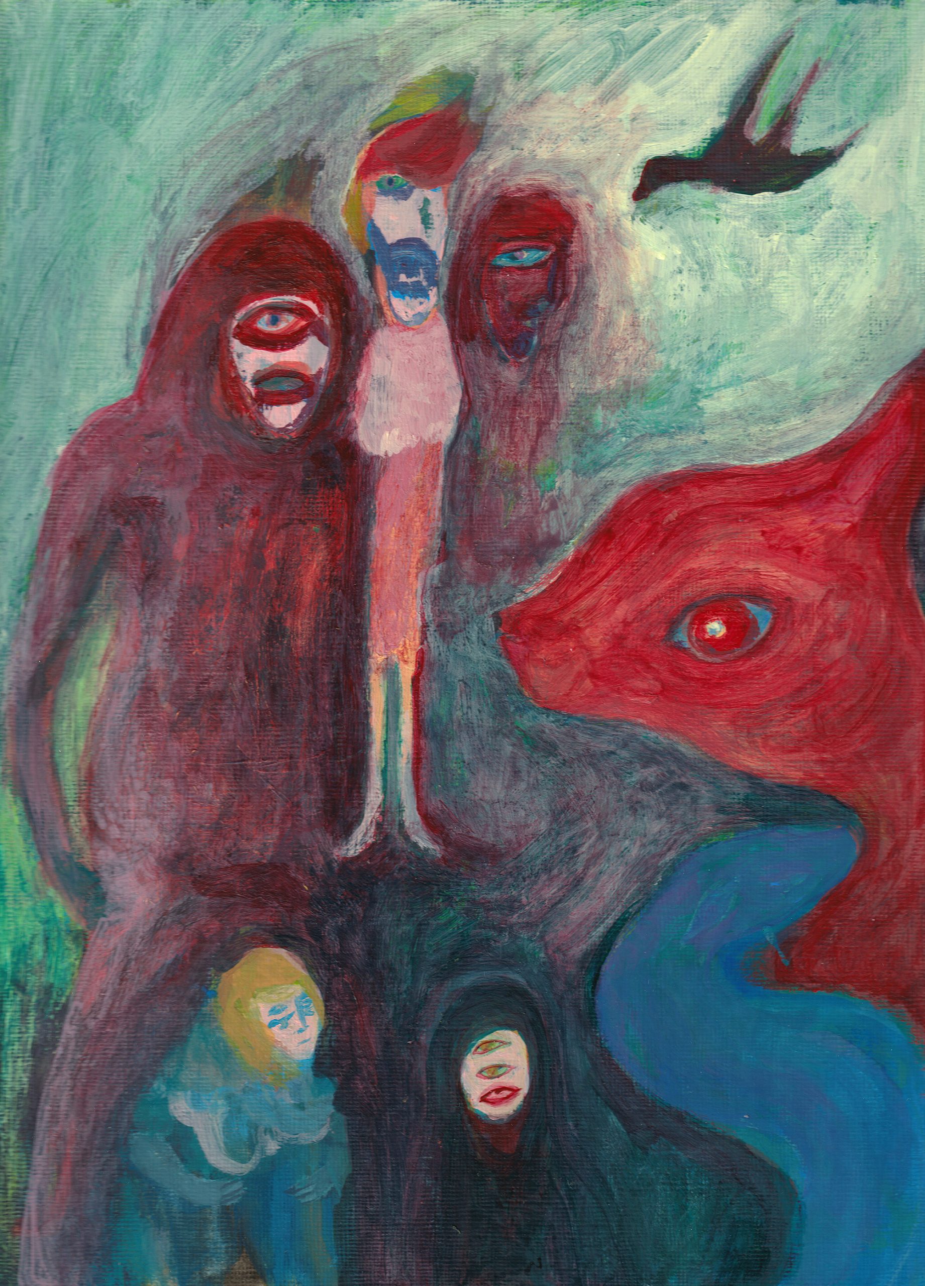 Pidän tarinoista. Hyvin usein ne muuttuvat kuvieni aiheiksi. Kuten kertomus Anubiksesta, joka vartioi kuolleita tai Horuksen silmä, joka katselee ja suojelee. Näyttelyn teosten tematiikka liittyy näkemiseen ja hereillä olemisen aiheisiin.