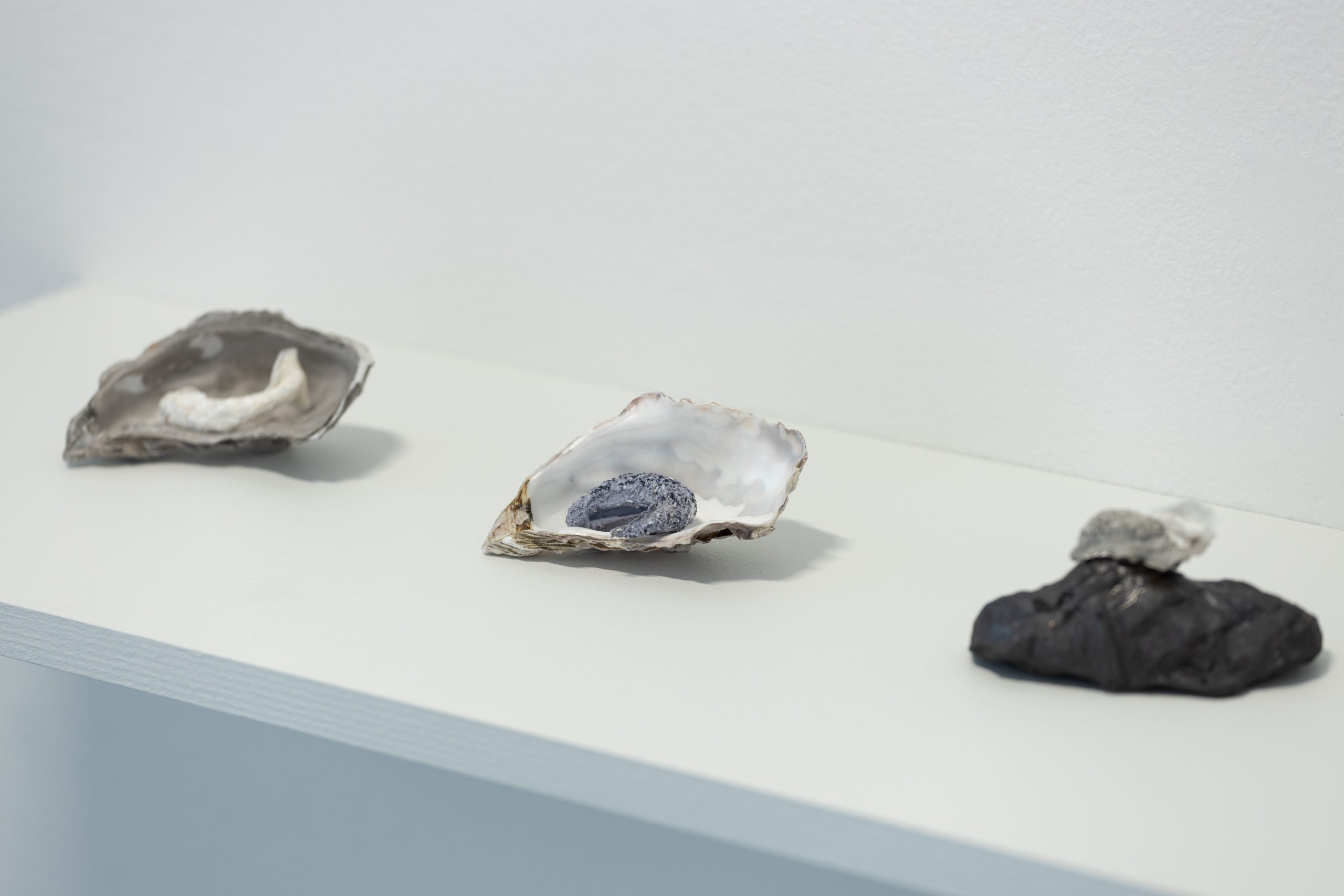 Skeletal Earths, Afterlife Waters brings together material produced during two residency periods. The exhibition continues Harriina Räinä’s long-term project, in which she examines oysters as part of ecological and human-shaped processes, as well as the material afterlife of their shells.