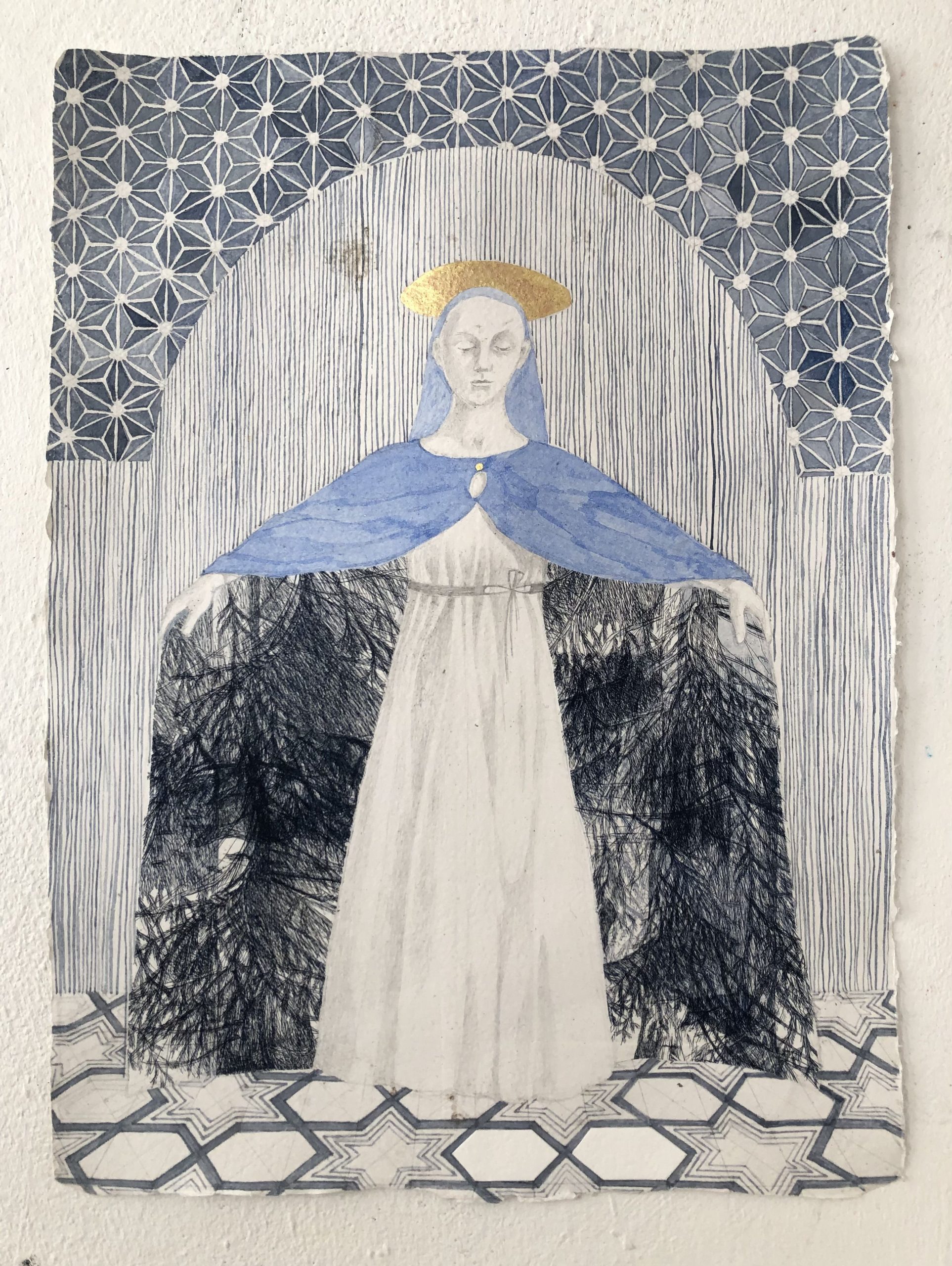 Metta Savolainen: Luonnonsuojelija, 2023, lyijykynä, akvarelli, viivasyövytys, lehtikulta