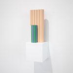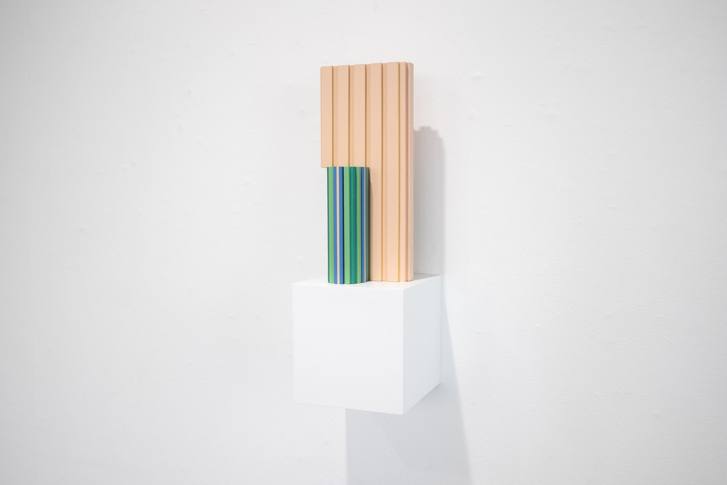Näyttelykokonaisuuteen kuuluu seinälle asettuvia reliefejä sekä kolmiulotteisia rakennelmia. Teokset ovat syntyneet visuaalisuuden ehdoilla, jota ainoastaan puun materiaalinen vastus on haastanut. Koen, että teokset palauttavat ilmaisuni kuvan rakenteellisten peruselementtien pariin; sommitteluun, värien vuorovaikutukseen, rytmiin ja muotoon.