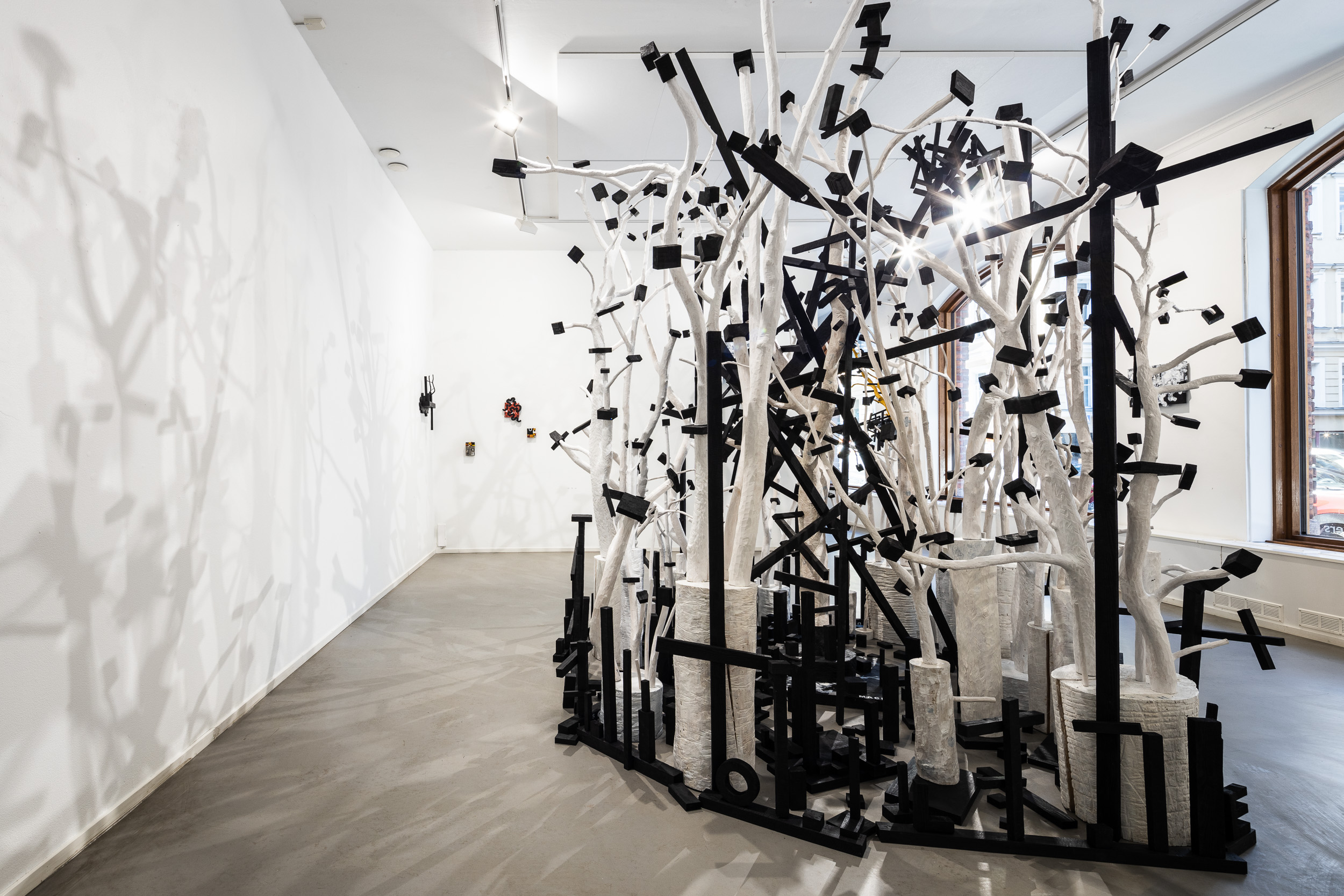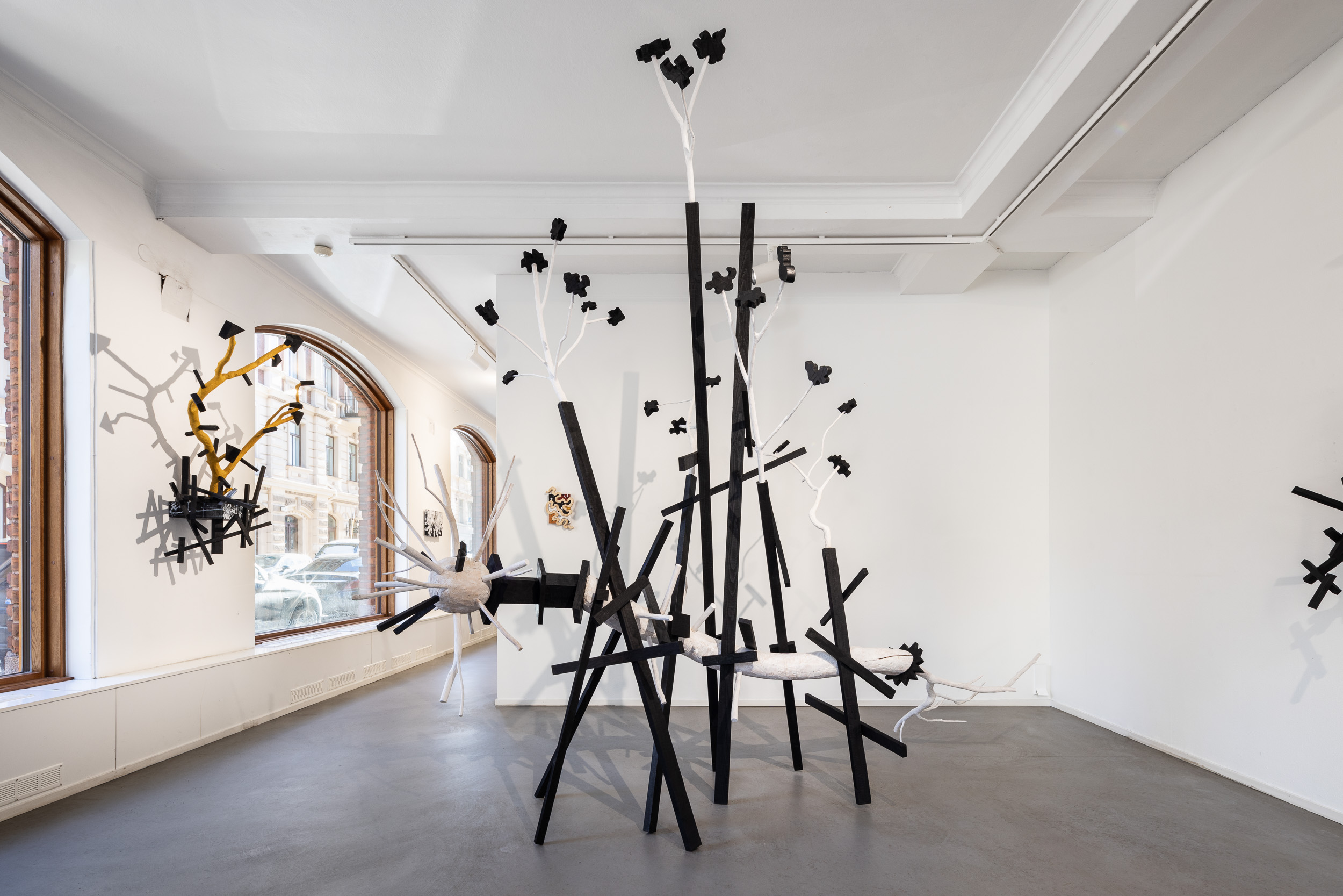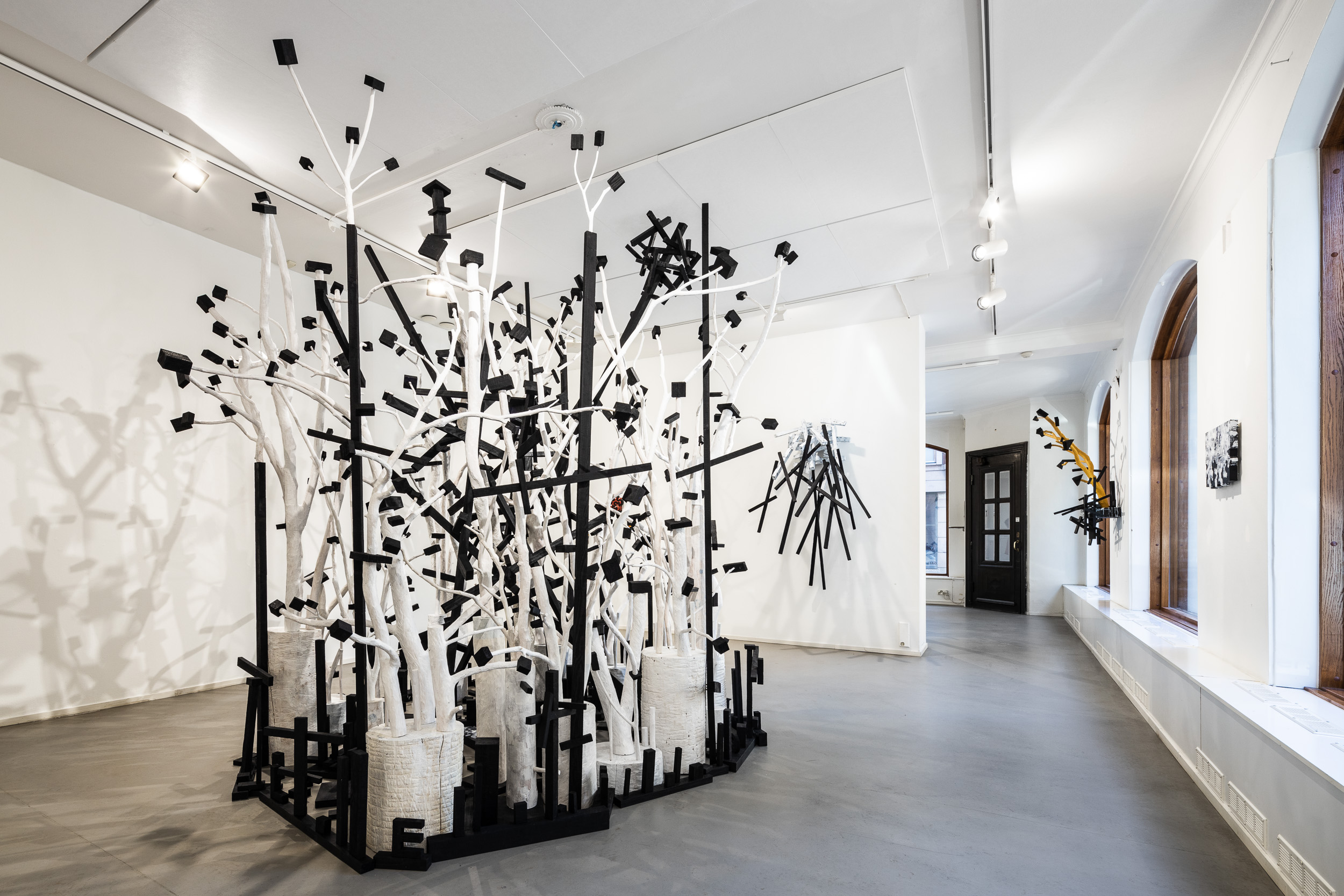 Näyttely esittelee isohkoja veistosinstallaatioita sekä pienempiä veistoksia puusta lattioille ja seinille. Vuoropuhelua luonnon muovaaman ja veistetyn puun sekä orgaanisen ja geometrisen muotokielen välillä