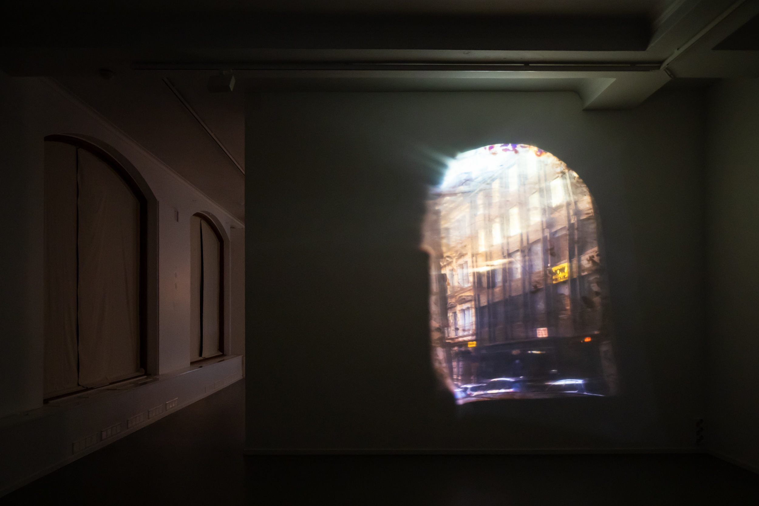 Näyttelyymme sisältyy paikkasidonnainen elementti, kaksi videoista on kuvattu galleriatilasta käsin. Toisessa laskevan auringon heijastus etenee pitkin vastapäisen talon julkisivua yhtenä maaliskuun iltana, toinen seuraa Korkeavuorenkadun ja Pienen Roobertinkadun risteysaluetta yhdeksän kuukauden ajan. Osa näyttelystä on nähtävissä myös gallerian ulkopuolelta ilta-aikaan.